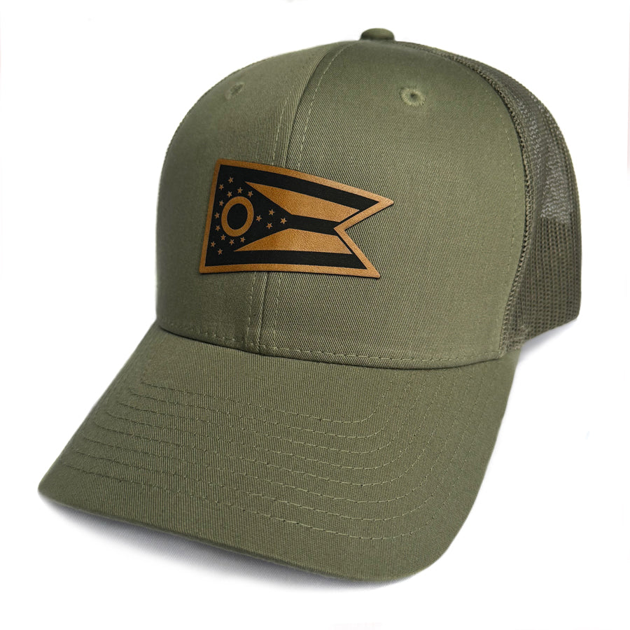 Show your pride for the Buckeye State in our NEW structured trucker hat. Snap Back Closure. Sage color cotton twill and mesh. Laser engraved Ohio Flag leatherette patch.